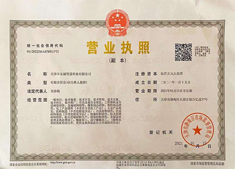 天津市友誠(chéng)管道科技有限公司是專注從事管道以及管道防腐業(yè)務(wù)的大型公司,公司注冊(cè)資金5000萬(wàn)元,位于中國(guó)管道生產(chǎn)基地-天津靜海大邱莊工業(yè)區(qū),近靠京滬高速公路、津石高速公路、津滄高速公路,距高鐵天津南站35公里,天津國(guó)際機(jī)場(chǎng)60公里,為客戶來(lái)訪及業(yè)務(wù)發(fā)展提供了便利的交通條件。